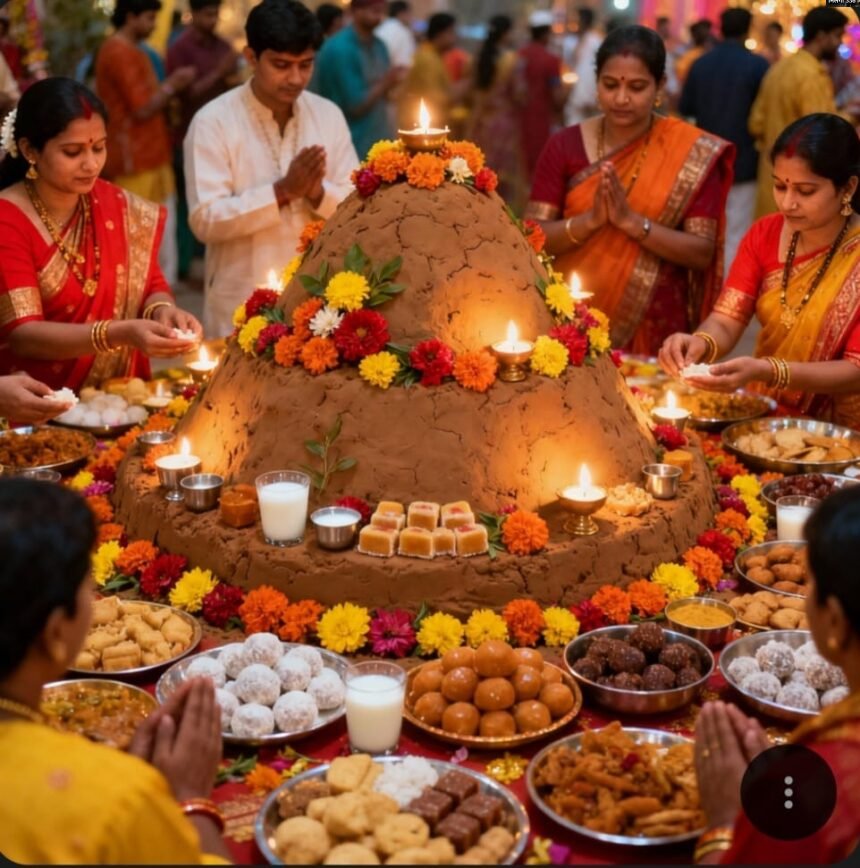 दीपावली के अगले दिन भारत के विभिन्न हिस्सों में समुदाय मिलकर अन्नकूट पर्व मनाते हैं — यह उत्सव समृद्धि, साझेदारी और दिव्य कृतज्ञता का प्रतीक है। जैसे किसी सामुदायिक पॉटलक में सभी लोग कुछ-न-कुछ लेकर आते हैं, वैसे ही यहाँ भी कोई मिठाइयाँ लाता है, कोई नमकीन या मौसमी व्यंजन। इन्हें सबसे पहले श्रीकृष्ण को गोवर्धन पूजन के रूप में अर्पित किया जाता है और बाद में भक्तों में बाँटा जाता है। यह भारत की हजारों साल पुरानी परंपरा है जो सिखाती है कि भोजन तभी पवित्र होता है जब वह बाँटा जाए — यह एक ऐसी लोक-संस्कृति है जो परिवार, पड़ोसी और अजनबी सभी को एक ही उत्सव-स्पंदन में जोड़ देती है।