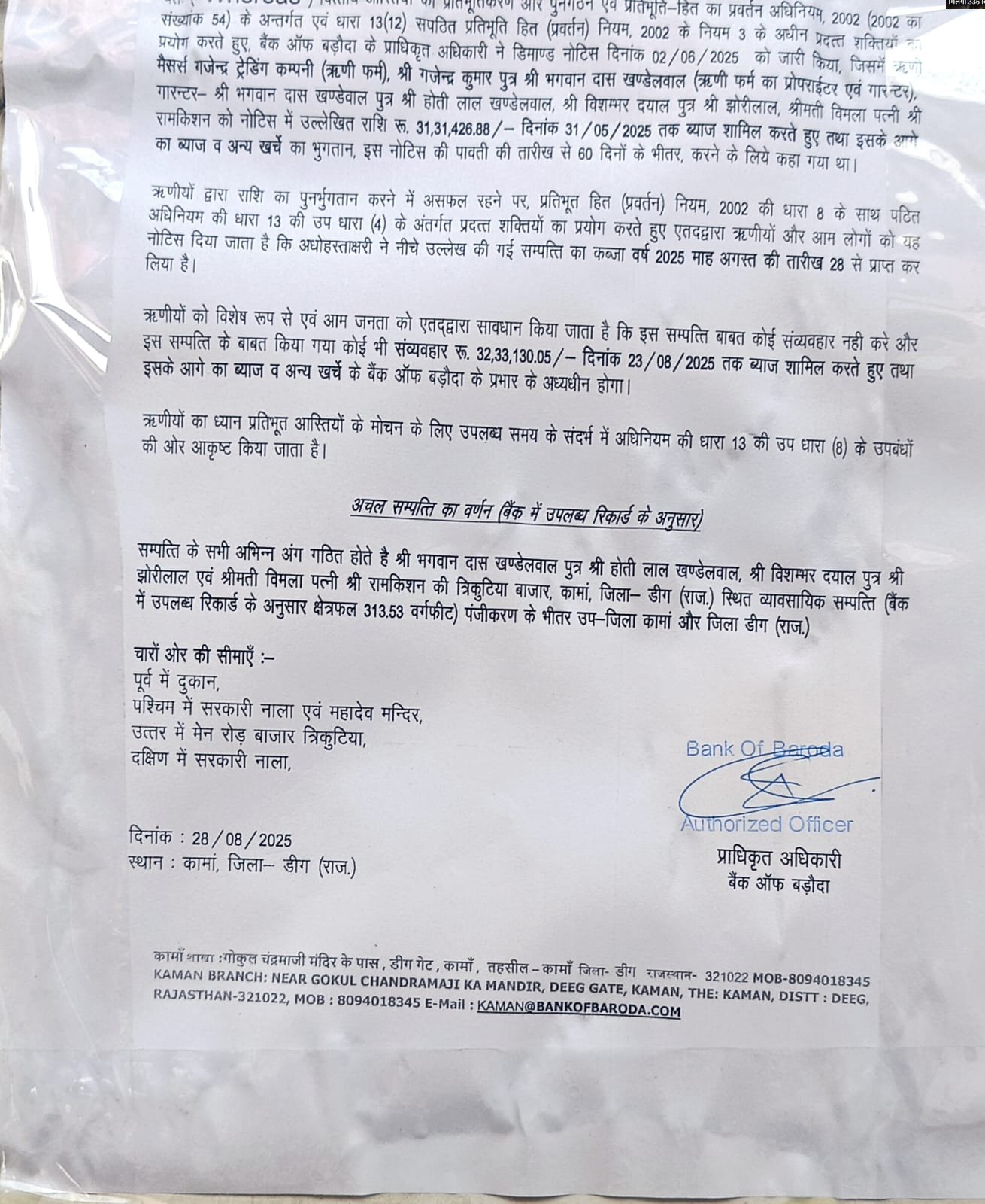 बैंक के अनुसार, भगवान दास खंडेलवाल ने बैंक ऑफ बड़ौदा से लोन लिया था, लेकिन वे उसे समय पर चुका नहीं पाए। इस कारण बैंक ने उन्हें पहले ही डिफॉल्टर घोषित कर दिया था। बैंक द्वारा कई बार नोटिस भेजे गए थे, और दो महीने पहले गवाह की दुकान पर भी नोटिस चस्पा किया गया था।