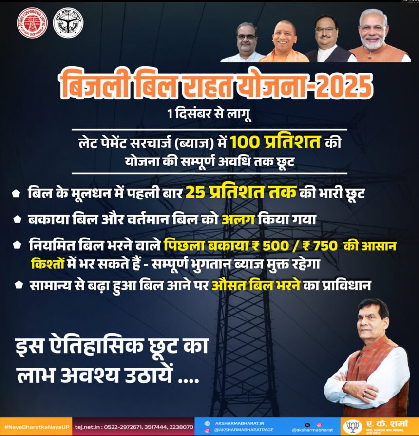 खेरागढ़ –: उत्तर प्रदेश सरकार ने बिजली उपभोक्ताओं के लिए बड़ी राहत की घोषणा की है। ऊर्जा मंत्री ए.के. शर्मा ने “बिजली बिल राहत योजना 2025” लॉन्च की, जिसके तहत नेवरपेड और लॉन्ग अनपेड उपभोक्ताओं को सरचार्ज में 100% और मूलधन में 25% तक की छूट मिलेगी। यह योजना 1 दिसंबर से शुरू होगी।