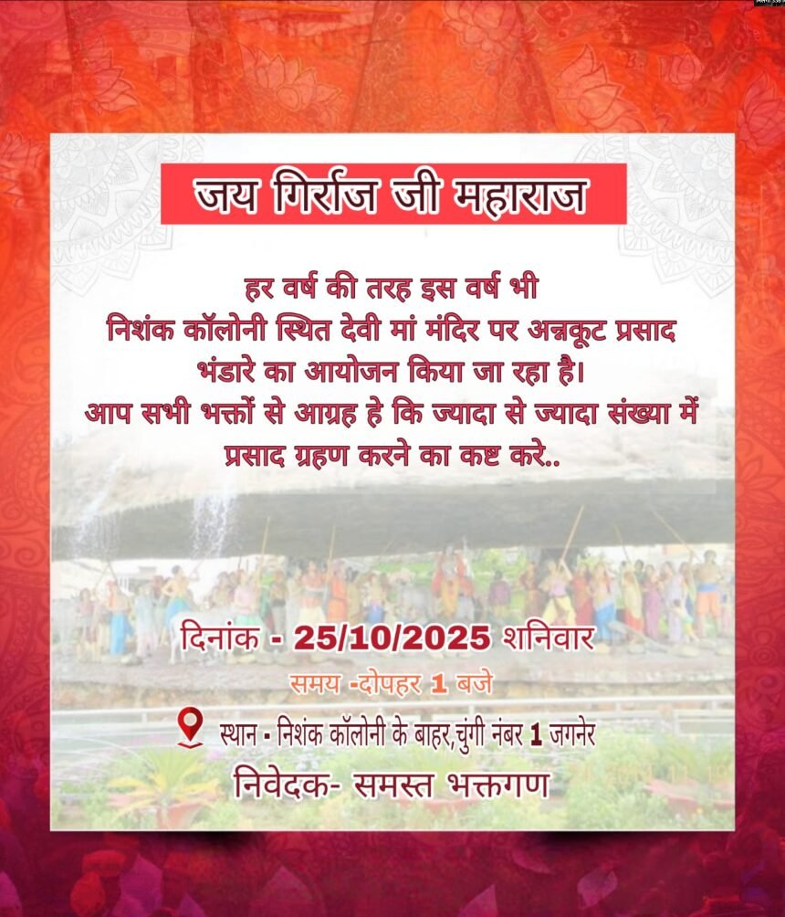 जगनेर। हर वर्ष की भांति इस वर्ष भी निशंक कॉलोनी स्थित देवी माँ मंदिर पर भव्य अन्नकूट प्रसाद भंडारे का आयोजन किया जा रहा है। यह आयोजन शनिवार, 25 अक्टूबर 2025 को दोपहर 1 बजे निशंक कॉलोनी के बाहर, चुंगी नंबर 1, जगनेर आयोजित होगा।