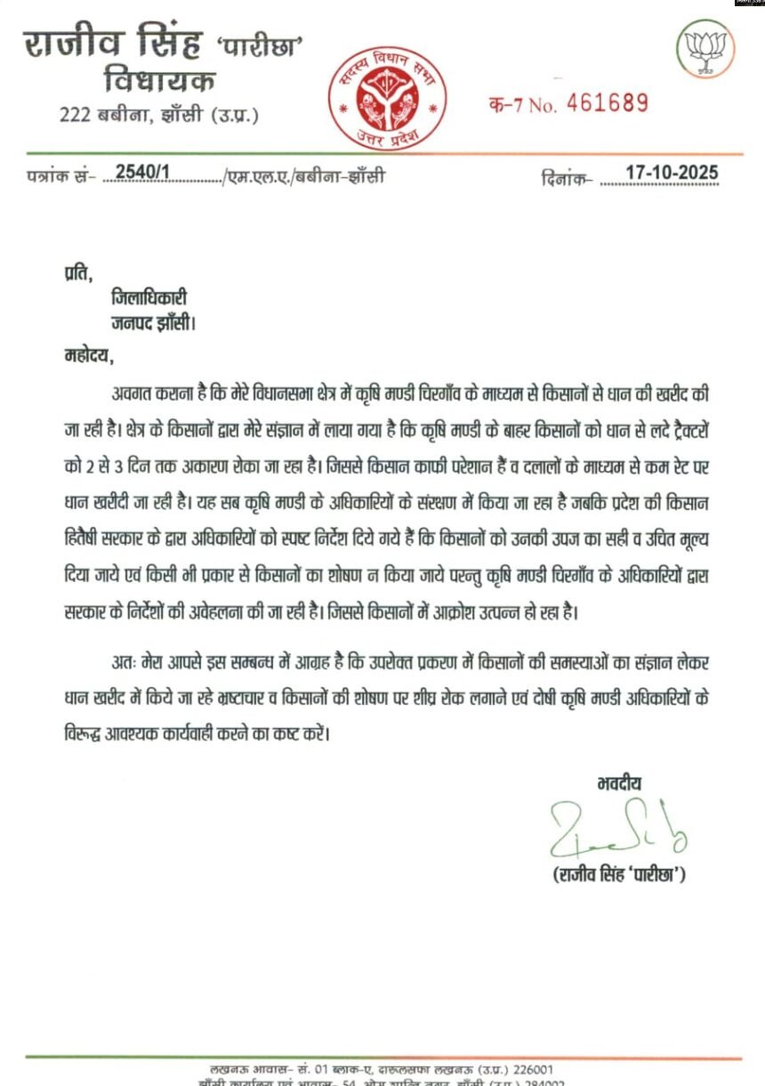 विधायक ने अपने पत्र में डीएम को बताया है कि बबीना विधानसभा क्षेत्र में कृषि मण्डी चिरगाँव के माध्यम से किसानों से धान की खरीद की जा रही है। क्षेत्र के किसानों द्वारा उनके संज्ञान में लाया गया है कि कृषि मण्डी के बाहर किसानों को धान से लदे ट्रैक्टरों को 2 से 3 दिन तक अकारण रोका जा रहा है। जिससे किसान काफी परेशान हैं व दलालों के माध्यम से कम रेट पर धान खरीदी जा रही है। यह सब कृषि मण्डी के अधिकारियों के संरक्षण में किया जा रहा है जबकि प्रदेश की किसान हितैषी सरकार के द्वारा अधिकारियों को स्पष्ट निर्देश दिये गये हैं कि किसानों को उनकी उपज का सही व उचित मूल्य दिया जाये एवं किसी भी प्रकार से किसानों का शोषण न किया जाये। परन्तु कृषि मण्डी चिरगाँव के अधिकारियों द्वारा सरकार के निर्देशों की अवेहलना की जा रही है। जिससे किसानों में आक्रोश उत्पन्न हो रहा है।