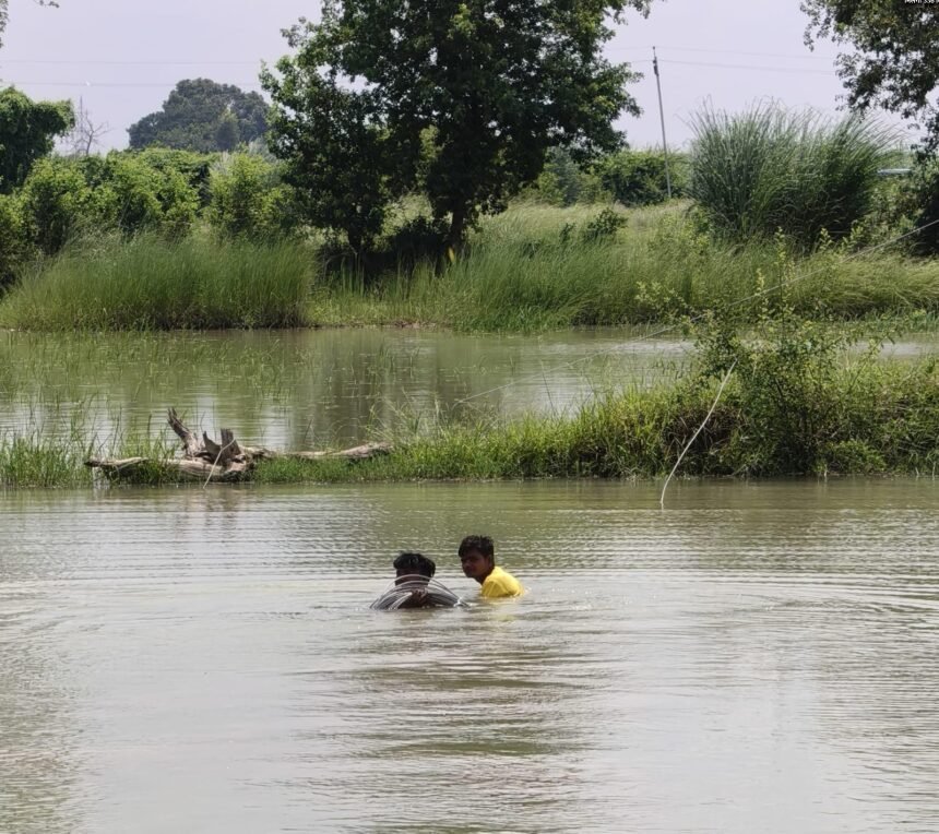तालाब बने खेत में विद्युत कर्मियों ने उतरकर क्षतिग्रस्त हुए पोल की जगह नया पोल लगाया ।