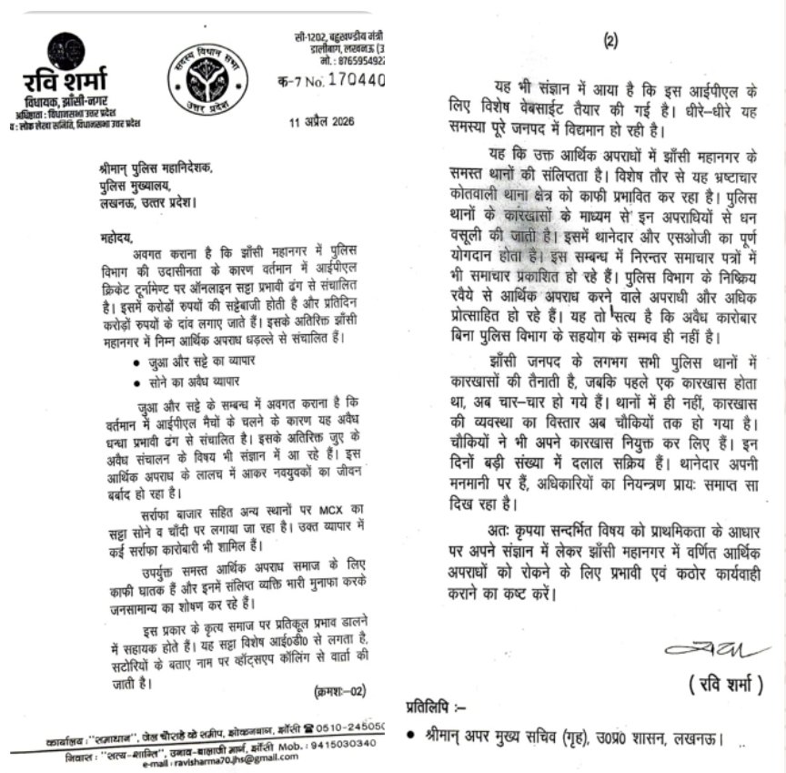 झाँसी (उत्तर प्रदेश): बुंदेलखंड की हृदयस्थली झाँसी में इन दिनों अपराधियों के हौसले बुलंद हैं, लेकिन इस बार हमला विपक्ष ने नहीं, बल्कि सत्ता पक्ष के कद्दावर नेता और सदर विधायक रवि शर्मा ने किया है। विधायक ने सीधे DGP (पुलिस महानिदेशक) को पत्र लिखकर झाँसी पुलिस और सट्टा सिंडिकेट के बीच चल रही ‘जुगलबंदी’ की पोल खोल दी है। इस “लेटर बम” की गूँज से सट्टा कारोबारियों और भ्रष्ट पुलिसकर्मियों में हड़कंप मच गया है।
