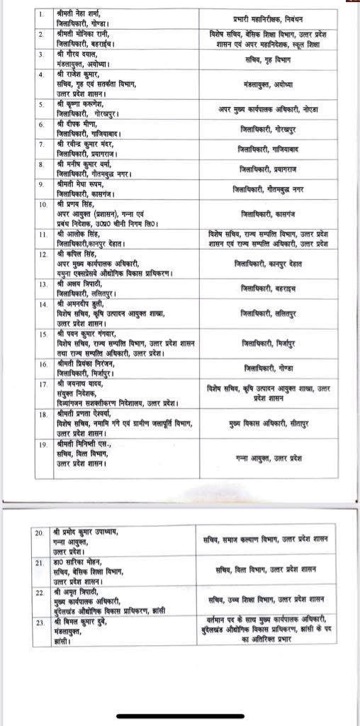 उत्तर प्रदेश में सोमवार देर रात एक बड़ा प्रशासनिक फेरबदल हुआ है, जिसमें 10 जिलों के जिलाधिकारियों (DM) सहित कुल 23 IAS अधिकारियों का तबादला किया गया है।