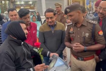 आगरा पुलिस का ‘गुलाब’ संदेश; बिना हेलमेट वालों को एसीपी सदर ने भेंट किए फूल